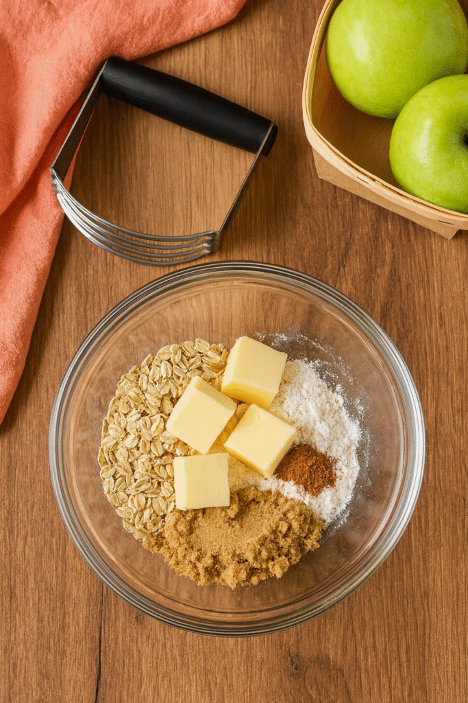 - Assembly Station: Gather brown sugar, oats, flour, spices, butter, and any extras. Cube the butter and set it in the fridge so it stays cold.