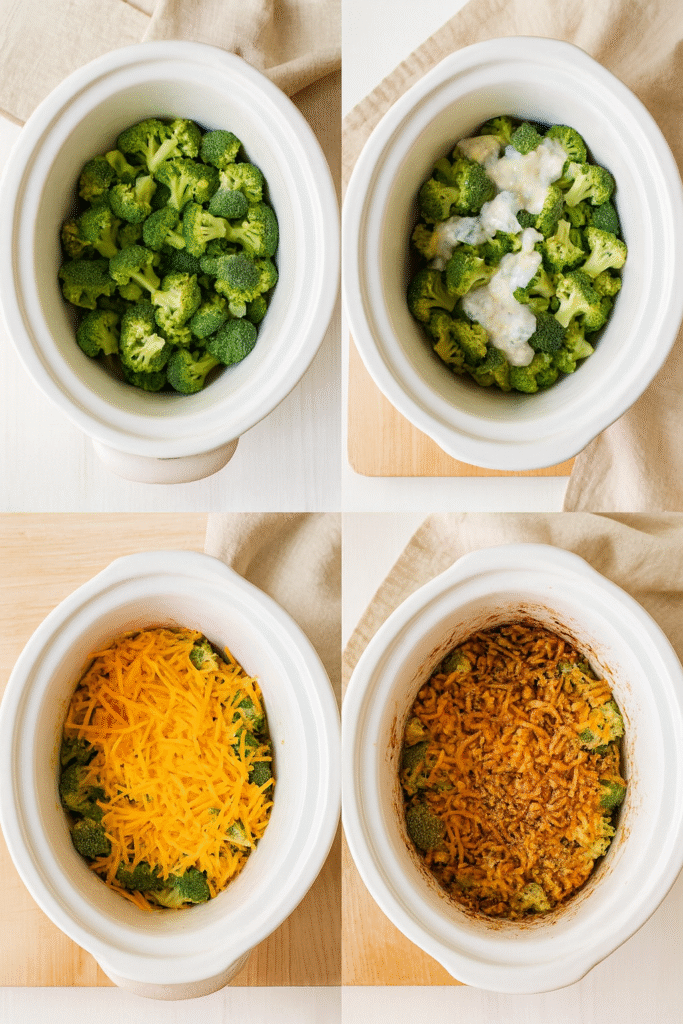 Start by chopping your broccoli into small florets bite-sized pieces cook best. Shred your own cheese if possible; pre-shredded doesn’t melt as smoothly thanks to anti-caking agents. Sauté your onions quickly in a skillet to bring out natural sweetness, though you can skip this step if in a time crunch. With everything prepped, making Slow Cooker Broccoli Casserole is simple and stress-free.